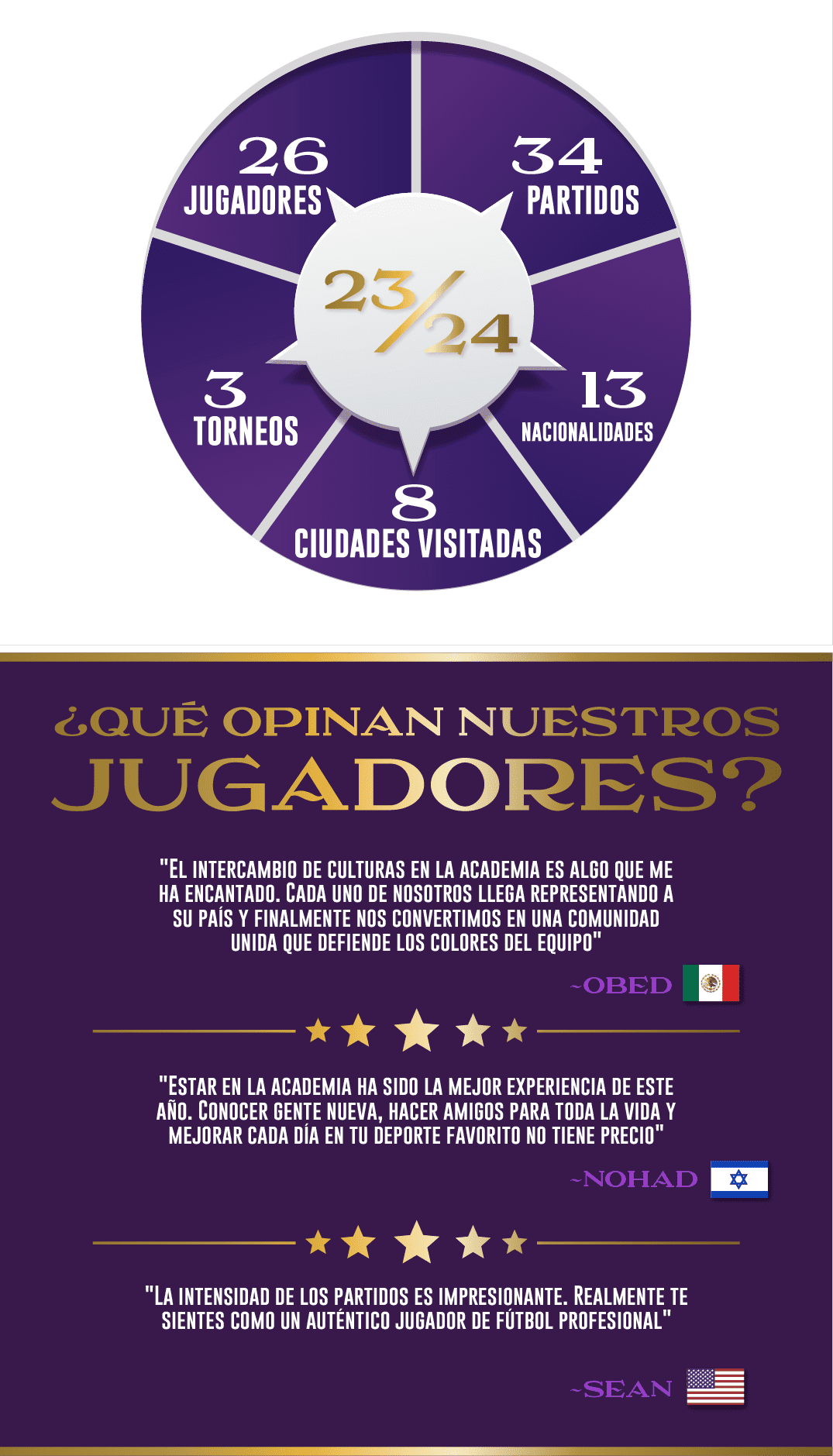 Hemos tenido el placer de contar con 26 jugadores de 13 países distintos comprometidos con su desarrollo futbolístico y la excelencia deportiva que caracteriza a nuestro equipo.
